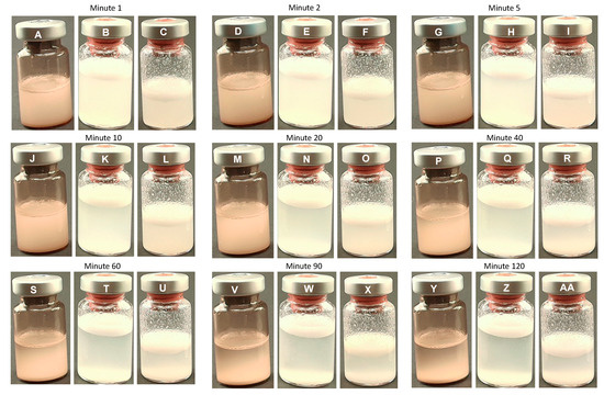 The reconstituted products were allowed to stand for the following observation time points: 1, 2, 5, 10, 20, 40, 60, 90, and 120 min. At each time point, the products were shaken vigorously (as per the IFU) before collecting the material for further analysis.