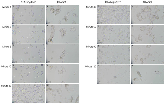 PLLA-LASYNPRO™: At the 40 min time point, the first signs of sedimentation of PLLA particles were observed. This phenomenon progressed gradually, with the transparency of the upper layers of the solution increasing as time passed. Notably, this sedimentation was not accompanied by any foam formation (Figure 2P,S,V,Y, respectively).
