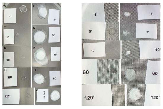 Sediment trace observed on the 71 µm sieve with the PLLA-LASYNPRO™ and PLLA-SCA (8 mL) solutions at different time points. PLLA-LASYNPRO™: (A,C,E,G,I) slides. PLLA-SCA: (B,D,F,H,J) slides.