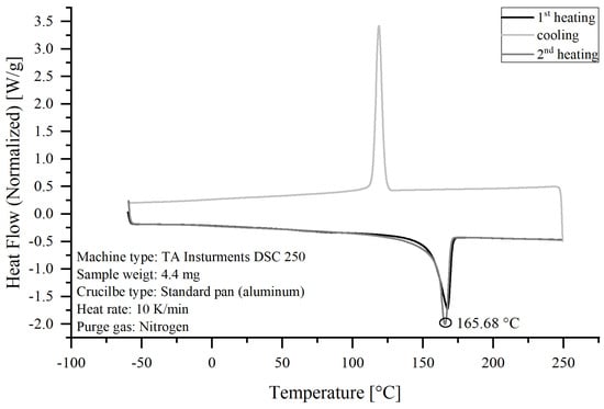 In this study, an isotactic PP homopolymer was used. The producers’ specifications state a melt flow rate of 1 g/10 min measured at 230 °C and 2.16 kg and a density of 0.905 g/cm3 at 23 °C []. The PP was analyzed using differential scanning calorimetry (DSC) to evaluate its melting temperature, and the PP’s melting temperature was ≈165 °C, as presented in Figure 1.