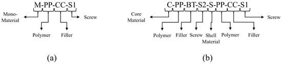 Both fiber types, the m-m as well as the c-s fibers, were produced in a two-step process. First, a strand was produced. Then, the strand was drawn to a fiber in the second step. In addition to the compounded materials, two reference fibers containing unprocessed PP were produced. The strands and fibers are labeled using the sample code explained by Figure 2.