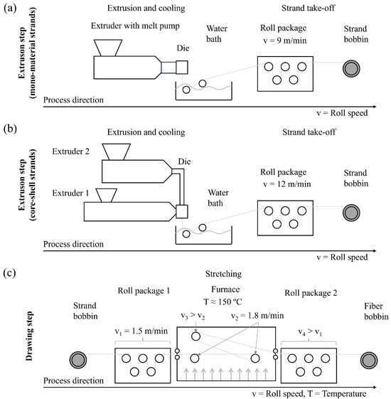 The strands for the m-m fibers were produced by an extrusion process, which is shown schematically in Figure 3a. For extrusion, a HAAKE PolyDrive single-screw extruder (Thermo Electron Corporation, Waltham, MA, USA) equipped with a melt pump was used. The extruder’ screw has a diameter of 19 mm and an L/D ratio of 25. The throughput was kept constant at 1.5 kg/h by the melt pump. The other extrusion parameters can be obtained from Table 3. The produced strand was cooled in a temperature-controlled water bath at ≈58 °C, taken off by a roll package with a speed of 9 m/min, and rolled up on a bobbin.