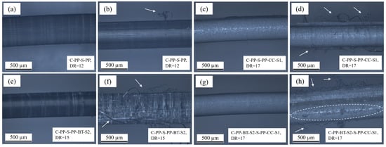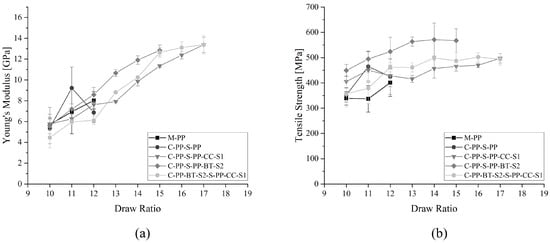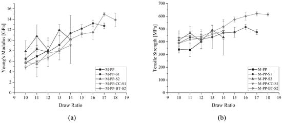 The mean average values of Young’s modulus and tensile strength for the different DR reached by the different m-m fibers are shown in Figure 4. The neat M-PP reference reaches the lowest DR of 12, where it also shows the highest tensile strength of 401.10 ± 54.31 MPa and Young’s modulus of 8.03 ± 0.85 GPa. The two compounded but unfilled PPs reached higher DR and also higher mechanical properties. M-PP-S1 gained a maximum DR of 17, while the highest tensile strength was 514.88 ± 21.65 MPa and Young’s modulus of 13.22 ± 0.60 GPa were reached at DR = 16. The tensile strength and Young’s modulus of M-PP-S2 were 491.72 ± 38.68 MPa and 11.94 ± 1.04 GPa at DR = 13. The highest DR reached by M-PP-S2 was 14. In the case of the m-m fibers containing fillers, M-PP-CC-S1 achieved its highest mechanical properties at its maximum DR of 14. The tensile strength was 484.21 ± 17.49 MPa and the Young’s modulus was 9.04 ± 0.22 GPa. While M-PP-BT-S2 reached 620.72 ± 18.46 MPa in tensile strength and 14.93 ± 0.35 GPa in Young’s modulus at DR = 17, while the maximum reached DR was 18.