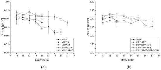 All fibers show decreasing densities with increasing draw ratio. In the m-m fibers in Figure 6a, two groups are visible. The first group, all materials without fillers, shows comparable densities and a similar development over DR. The second group, M-PP-CC-S1 and M-PP-BT-S2, shows a higher starting density, which holds on in comparison with the unfilled materials. This difference is a result of the added fillers. CC, which is based mainly on calcite, has a density of 2.72 g/cm3 [], while the BT has 1.8 g/cm3 []. Accordingly, the density of the composite materials is higher. During fiber drawing, voids are created in the drawing direction around the fillers, as shown by different publications [,,,], which reduces the density of the fibers with increasing DR. The decreasing density of the fibers without fillers also results from created voids during drawing. These structural changes have been well described for polyolefins by different authors [,,]. The here presented results also fit in with the observations by Baltá-Calleja and Peterlin [] and Sokkar et al. [], which both describe a reduction in density as a drawing effect. In terms of the c-s fibers in Figure 6b, no clear difference between the unfilled fibers and the ones containing fillers is visible. But the same density-decreasing trends for higher draw ratios as presented and explained for the m-m fibers are visible.