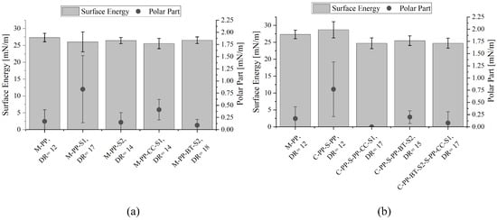 The average surface energy and polar parts of the m-m and c-s fibers at their maximum DR are shown in Figure 7. The results yielded no signs of influence by the added fillers in the m-m fibers, as all surface energies lie in the same range between 25.57 ± 1.53 and 27.32 ± 1.25 mN/m. Also, the polarity is low with a maximum value of 0.83 ± 0.69 mN/m for M-PP-S1 (see Figure 7a). The same is shown in the case of the c-s fibers. The highest surface energy and polar part are reached by the reference c-s fiber (C-PP-S-PP) with 28.71 ± 2.4 mN/m and 0.77 ± 0.56 mN/m, respectively (see Figure 7b). It seems like there is a slight decrease in the surface energy of the filled c-s fibers compared to their m-m counterparts, but the mean values are lying in the standard deviations of each other.