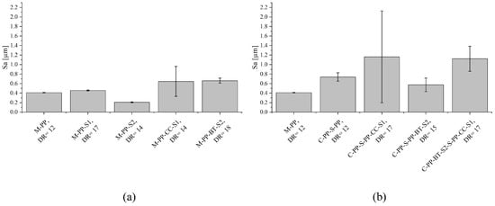 Figure 8 presents the average surface heights of all fibers investigated in this study at their maximum DR. Further, Figure 9 shows one representative picture obtained from CLSM for every fiber material. The m-m fibers without fillers show low surface heights between 0.21 ± 0.01 µm for M-PP-S2 and 0.46 ± 0.01 µm for M-PP-S1. These are surpassed by filled m-m fibers, where M-PP-CC-S1 reaches 0.64 ± 0.31 µm and M-PP-BT-S2 reaches 0.66 ± 0.05 µm (see Figure 8a). A comparison of Figure 9a–e matches these results, as there is a lot more texture visible for the filler containing fibers.