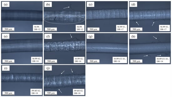 Table 5 shows the equivalent fiber diameter, a calculated aspect ratio, and the Young’s modulus and tensile strength for all produced fibers at their maximum DR. M-PP-BT-S2 shows the highest DR of 18 as well as the highest aspect ratio and mechanical properties. The reference fibers M-PP and C-PP-S-PP, which show the lowest maximum DR of 12, also show the highest fiber diameters and the lowest mechanical properties of all fibers.