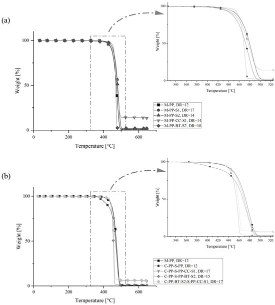 The differences in mechanical properties between two DRs lie within the standard deviation. But some trends can be retrieved from the results. For all m-m fibers, the mechanical properties are improving with increased DR. Further, the compounded but unfilled PP references surpass the DR of the raw PP-100 reference. The compounding process could lead to reduced lengths of the molecular chains and resulting changed molecular weights, which influences the polymers drawability and mechanical properties, as shown by Kamezawa et al. []. Also, the filler-containing materials surpass the M-PP reference. But, in the case of S1, the filled M-PP-CC-S1 stays behind M-PP-S1, which can be explained by a hindered orientation of the molecular chains caused by the block-like-shaped CC particles. On the other hand, M-PP-BT-S2 surpasses all other materials clearly, which indicates an increased drawability as a result of the platelet structure of the BT filler. Van Erp et al. [] observed a similar effect and explanation in their research on montmorillonite-filled and drawn tapes.