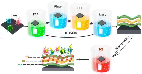 Following this, the integration of TCS was carried out using the impregnation method. Substrates with (PAA/CHI)n coatings were immersed in 10 mL of TCS solution for 24 h and dried at room temperature. The substrates were placed in a horizontal position during drying at room temperature to ensure uniform coating formation. The concentration of TCS was 0.5 mmol/L.