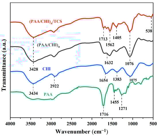 FTIR spectra of PAA, CHI, (PAA/CHI)n, and (PAA/CHI)n/TCS coatings.