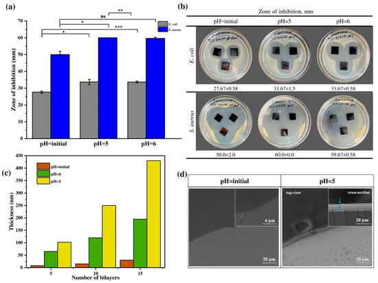 (a) ZOI in relation to Gram-positive and Gram-negative bacteria, (b) optical images demonstrating antibacterial activity of TCS incorporated coatings formed at different pH, (c) thickness of multilayer coatings (PAA/CHI)n, and (d) SEM images of coatings (PAA/CHI)n. Statistically significant differences are reported as: *** (p < 0.001), ** (p < 0.01), * (p < 0.05), and ns—no significance.