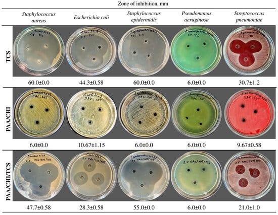 The well method was used to evaluate the antimicrobial activity of single TCS, double PAA/CHI, and triple PAA/CHI/TCS substances. For testing, a bacterial suspension with a concentration of 1.5 × 108 CFU/mL was prepared, after which it was evenly seeded onto Mueller–Hinton agar in a volume of 1.5–2 mL. The seeding was carried out using sterile cotton swabs, which were pre-dipped into the suspension of microorganisms, lightly squeezed against the wall of the test tube and evenly distributed over the surface of the agar with three smears, turning the dish by 60°. The tested microorganisms were Staphylococcus aureus ATCC 6538, Escherichia coli ATCC 8739, Staphylococcus epidermidis ATCC 12228, Streptococcus pneumoniae ATCC BAA 660, and Pseudomonas aeruginosa ATCC 9027. Then, wells of 6 mm in diameter were formed in the agar using a sterile punch and filled with the test substances. Incubation was carried out at 37 °C for 24 h, after which the diameter of the inhibition zone around the wells was measured. Antimicrobial activity was assessed by measuring the mean values and standard deviation. The results were analyzed according to the CLSI standard.