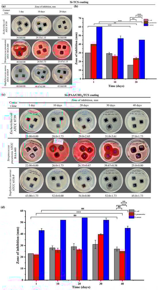 (a) Optical images showing the antibacterial activity of Si-TCS coatings after 1, 10, and 20 days of storage, (b) zone of inhibition analysis of Si-TCS coatings, (c) optical images of Si-(PAA/CHI)n/TCS coatings demonstrating antibacterial activity after 10, 20, 30, and 40 days of storage, (d) zone of inhibition analysis of Si-(PAA/CHI)n/TCS coatings. Statistically significant differences are indicated as: *** (p < 0.001), ** (p < 0.01), and ns—not significant.