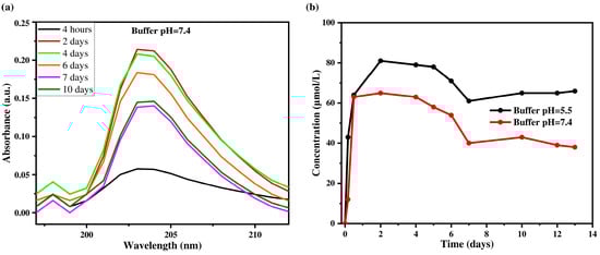 Absorption spectra of triclosan solution released at different time intervals (a) and kinetics of TCS release at different time intervals (b) in PBS buffer solutions with pH 7.4 and pH 5.5.