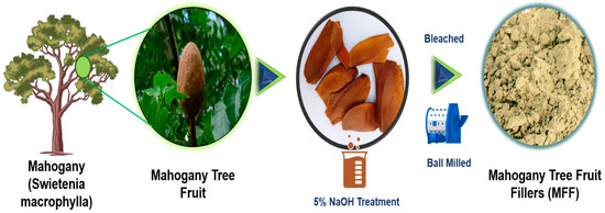 Mahogany fruit (Family: Meliaceae; Order: Sapindales) of the genus Swietenia was carefully processed to remove the seeds and outer shell, exposing the fibrous core rich in cellulose (40–50%) and lignin (20–35%), as listed in Table 1. The extracted core was cut into smaller pieces to facilitate further processing (Figure 1). To enhance its compatibility with the polymer matrix, mahogany fruit fiber was subjected to alkali treatment using a 5% NaOH solution. This treatment effectively removed impurities, hemicellulose, and lignin to improve interfacial adhesion, as shown in Table 1. After the alkali treatment, the fibers were thoroughly washed with distilled water to eliminate any residual NaOH and subsequently dried in a hot air oven at 60 °C for 24 h to remove any remaining moisture. Once dried, the fibers were ground into a fine powder using a mechanical grinder and sieved to achieve particle sizes ranging from 30 to 50 µm. The refined MFF was then incorporated as a reinforcing material into the composite fabrication process, contributing to the improved mechanical performance and sustainability of the composites.