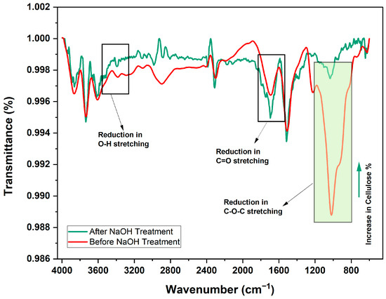 The FTIR analysis (Make: FT/IR-4000 Series—Jasco Inc., Tokyo, Japan) of untreated and 5% NaOH-treated mahogany fruit fillers (MFFs) across the 4000 to 400 cm−1 wavenumber range shown in Figure 2 revealed significant chemical changes that enhanced the mechanical strength of the composites. The spectra show a reduction in O-H stretching (3400 cm−1) and C=O stretching (1730 cm−1) peaks after treatment, indicating decreased hemicellulose (18.2% to 10.3%) and lignin (23.5% to 13.1%) contents, alongside a lower moisture content (11.1% to 7.6%). Cellulose-related C-O-C peaks (1050 cm−1) became more prominent, reflecting an increase in cellulose content (37.4% to 52.5%). These changes improved the mechanical properties of the MFF-reinforced composites by enhancing cellulose reinforcement, which increased the tensile strength of the natural filler hybrid composites and increased fiber–matrix bonding through reduced amorphous components, leading to a 15–20% improvement in tensile and flexural strength. Additionally, the reduced moisture content improves dimensional stability, ensuring consistent performance under load, making MFF a promising filler for high-strength composite applications.