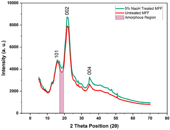XRD analysis (Figure 3) of untreated and 5% NaOH-treated mahogany fruit fillers (MFFs) in the 2θ range of 0° to 80° highlights the structural enhancements that significantly improve the mechanical properties of MFF-reinforced composites. The diffractograms show characteristic peaks of cellulose I, identified by the (101), (002), and (004) planes at 2θ = 15.96°, 21.57°, and 34.21° for untreated MFF, which shifted slightly to 16.09°, 21.87°, and 34.67° post treatment, with the (002) peak intensity indicating higher crystallinity. Cellulose I, the native form of cellulose in plants, was confirmed by these peak positions, which are typical of its monoclinic lattice structure and are commonly found in lignocellulosic materials such as mahogany. The amorphous region is identified by the minimum intensity between the (101) and (002) peaks at 2θ = 18.61°, with intensities of 1000 a.u. for untreated MFF and 800 a.u. for treated MFF, reflecting non-crystalline components such as hemicellulose and lignin. The crystallinity index (CrI), calculated using the Segal method, increased from 86.67% to 90.07%, driven by the removal of amorphous hemicellulose (18.2% to 10.3%) and lignin (23.5% to 13.1%), while the cellulose content increased from 37.4% to 52.5%. The crystal size, determined using the Scherrer equation, increased from 8.10 to 8.99 nm, indicating larger crystallites and improved structural order. These changes enhance the composite tensile strength by increasing cellulose reinforcement and stiffness, while improving fiber–matrix bonding due to reduced amorphous content, boosting the tensile and flexural strengths. Additionally, the lower moisture content (11.00% to 7.00%) inferred from the reduced amorphous regions ensured dimensional stability, supporting consistent mechanical performance under load, making treated MFF a promising filler for high-strength composite applications.