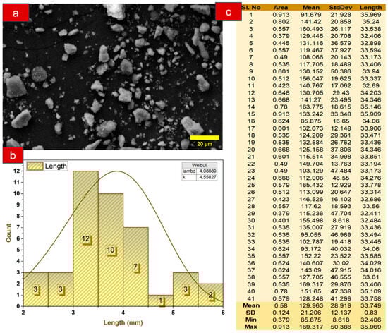 Particle size analysis (Figure 4) of 5% NaOH-treated mahogany fruit fillers (MFFs), conducted using ImageJ software (Version: 1.54p) on scanning electron microscopy (SEM) images, provided insights into the refined particle size distribution and its role in enhancing the mechanical properties of MFF-reinforced composites. The SEM images were processed using ImageJ by converting them to 8-bit grayscale, applying a threshold to isolate the particles, and using the “Analyze Particles” function, revealing a mean particle size of 33.749 µm with a standard deviation of 0.83. The analysis showed that a significant portion of the particles was below 40 µm, a result of alkali treatment removing hemicellulose and lignin, which causes fibrillation and breaks down fiber bundles into finer fragments, as observed in the SEM images displaying increased surface roughness and smaller particle clusters. This reduction in particle size increases the surface area, improving fiber–matrix interfacial bonding in the composites by enhancing adhesion and load transfer, which contribute to higher tensile and flexural strengths. Finer particles also ensured better dispersion within the polymer matrix, reducing voids and promoting uniform reinforcement, leading to improved mechanical consistency across the composite.