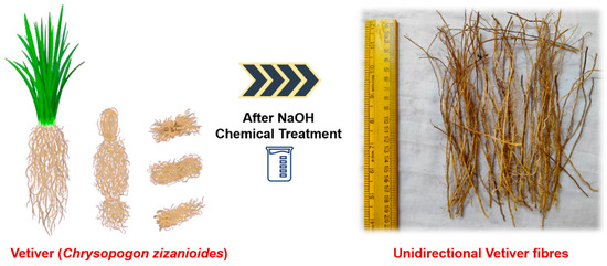 - Janyakunmongkol, K.; Nhuapeng, W.; Thamjaree, W. Effect of Alkaline Treatment on Mechanical Properties of Composites between Vetiver Fibers and Epoxy Resin. J. Mech. Behav. Mater. 2024, 33, 20220310. [Google Scholar] [CrossRef]