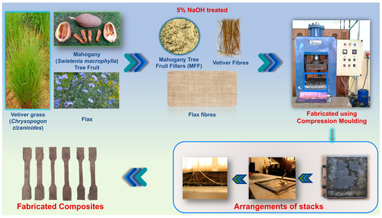Mahogany fruits and vetiver roots were obtained from Coimbatore (Tamil Nadu, India). A unidirectional flax fiber mat was obtained from Go-Green Composites (Chennai, Tamil Nadu, India). Epoxy resin (LY 556), hardener (HY 951), and 99% pure NaOH pellets were provided by Covai Seenu & Co. Ltd. (Coimbatore, Tamil Nadu, India).