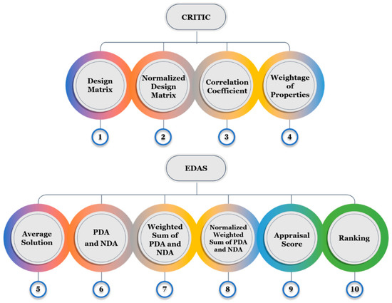 In this study, the CRITIC method was used to assign weights to various properties that influence the performance of the developed FVM hybrid composites, such as tensile strength, flexural strength, and impact resistance. These weights were incorporated into the EDAS method to evaluate and rank the composite variants based on their performance. This combined approach of CRITIC and EDAS ensured a systematic, objective, and reliable assessment of composite properties, enabling the identification of optimal configurations for specific applications. Detailed algorithms are provided in the Supplementary File.