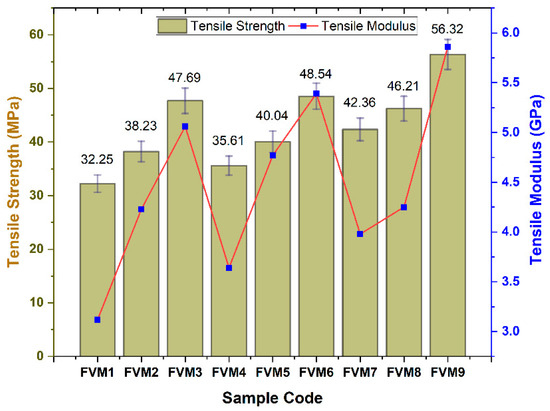 The tensile strength of the FVM composites peaked at 56.32 MPa for FVM9 (20% flax, 20% vetiver, 0% MFF), whereas FVM1 (10% flax, 10% vetiver, 0% MFF) exhibited the lowest at 32.25 MPa, with tensile modulus values reaching 5.9 GPa for FVM9 (Figure 8). At the microstructural level, FVM9’s superior tensile strength is driven by the high cellulose content of flax fibers (73.7% post NaOH treatment), which enhances fiber stiffness and facilitates efficient load transfer along the fiber axis. The increased fiber content (20% flax, 20% vetiver) ensured a more uniform fiber distribution, minimizing stress concentrations and reducing void content, which is often a source of failure in natural fiber composites. Vetiver fibers, with 48.7% cellulose and higher flexibility due to 6.8% lignin, act as secondary reinforcements, bridging microcracks and distributing stresses across the matrix, as their rougher surface (post alkali treatment) enhances mechanical interlocking with the epoxy. The absence of MFF in FVM9 avoided potential agglomeration, which can occur at higher filler contents (>10 wt.%), leading to stress concentration points and reduced tensile strength, as observed in FVM3 (5% MFF, 41.87 MPa).
