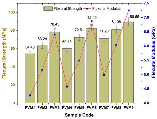 The flexural strength was highest for FVM9 at 89.65 MPa, with a modulus of 7.0 GPa, whereas FVM1 recorded the lowest at 54.43 MPa (Figure 9). Microstructurally, FVM9’s enhanced flexural performance results from its layered configuration, where flax fibers form a rigid core (73.7% cellulose, high stiffness) and vetiver fibers, as outer layers, provide toughness (6.8% lignin). This arrangement minimizes shear stresses at the fiber–matrix interface during bending, as flax resists compressive forces on the inner layers, whereas vetiver’s flexibility absorbs tensile stresses on the outer layers, reducing the likelihood of delamination. The higher fiber content in FVM9 (20% each) ensured a denser fiber network, decreasing void content and enhancing stress transfer, as voids can act as crack initiation sites under flexural loading.