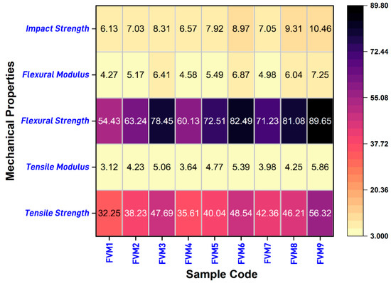 Alkali treatment plays a critical role in increasing cellulose content (e.g., MFF: 37.4% to 52.5%) and reducing moisture, which strengthens the fiber–matrix interface, reducing the likelihood of fiber pull-out or delamination. In MFF-inclusive samples (e.g., FVM6 and FVM8), the filler improved matrix cohesion by filling microvoids, although agglomeration occurred at higher contents (>10 wt.%) introduces stress concentration points, deteriorating performance by initiating micro-cracks. Lower-performing samples, such as FVM1, suffer from sparse fiber networks, higher void fractions, and weaker interfacial bonding, leading to stress concentrations and rapid crack propagation at the microstructural level. These findings highlight the importance of optimizing the fiber ratios and filler content to achieve a uniform microstructure, suggesting that future studies could employ SEM analysis to directly visualize the fiber distribution and void content, further elucidating the microstructural mechanisms driving mechanical performance.