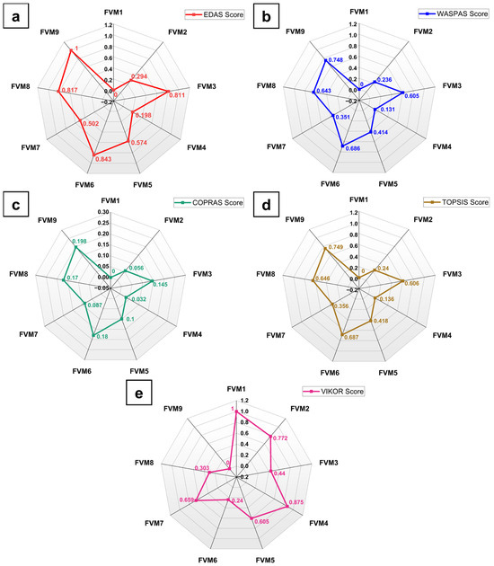 To ensure the reliability of the rankings, alternative MCDM methods, including WASPAS, COPRAS, TOPSIS, and VIKOR, were applied to the dataset. Figure 12 and Table S4 present the scores and ranks obtained using each method, respectively. The rankings produced by all methods showed consistent top performance for FVM9, followed by FVM6, and FVM8. The near-unanimity of the top-ranking alternatives across methods demonstrates the robustness and reliability of the CRITIC–EDAS approach.