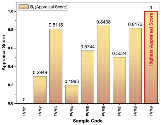 Normalized weighted sums (NSPi and NSNi) were calculated to standardize the distances across all alternatives (Table 8). The final appraisal scores (Øi) were determined by averaging NSPi and NSNi scores. FVM9 emerged as the top-performing composite with a perfect Øi score of 1, whereas FVM1 ranked the lowest with a score of zero. These results are consistent with the mechanical testing results, validating the robustness of the EDAS method for ranking composite materials.