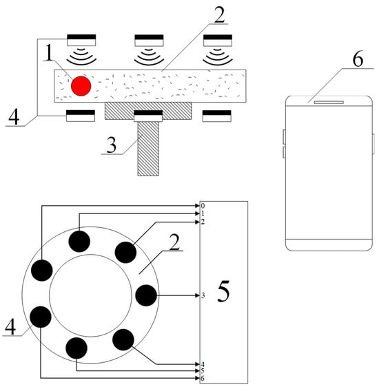 The principle of operation of the proposed type of viscometer, as in the case considered, in particular, in [], is based on the induced rotation of the ball (1) located inside the measuring cell (2). This cell is filled with the test fluid and is located on a rotating bed (3). The ball is involved in a circular motion due to high enough viscosity of the solution. Seven optoelectronic pairs (4) are used to record the rotation pattern of the ball, allowing the capture of a circular image split into seven pixels. Optoelectronic pairs (4) are set to threshold actuation, i.e., at the output of each of them a signal is generated that corresponds to either a logical zero or a logic one. Signals taken from pairs (4) are fed to the primary signal processing unit (5), which performs, among other things, the operation of digital logarithm. All other operations that are computational procedures, as shown in [,], should be performed using a program installed on the user’s smartphone or iPhone (6). Data transmission from the unit (5) to the smartphone is carried out using a Bluetooth module on phone (6).