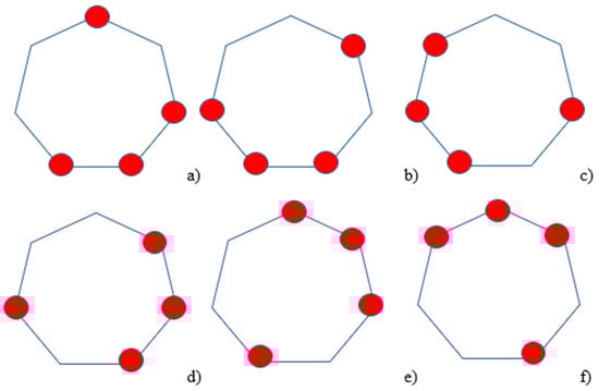 The specific characteristics of the functions taking values in the base field GF(2), corresponding to the above-mentioned indices, are illustrated in Figure 2. The vertices of the heptagons marked with red circles correspond to values of 1; otherwise, the value is 0.