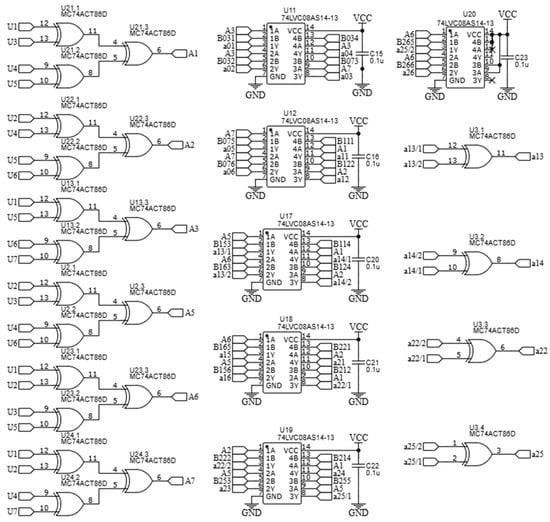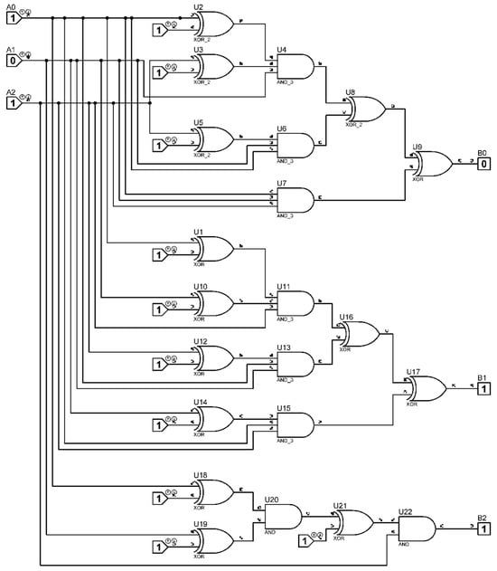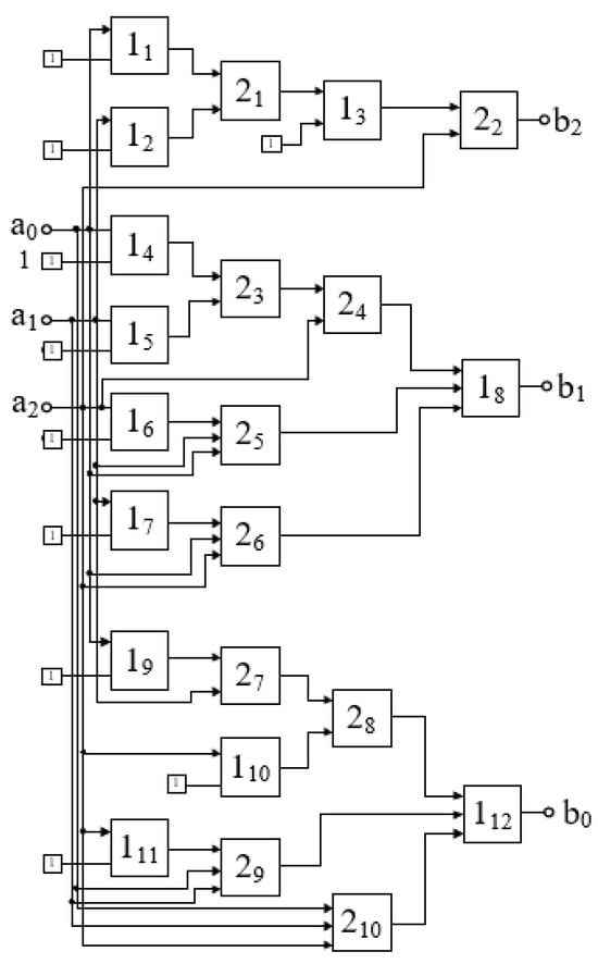 Block (2) has six inputs and six outputs, while block (3) has six inputs and eighteen outputs. The design of these blocks is relatively simple, as they are entirely based on logic elements that perform modulo-2 addition. Their overall circuit diagram is shown in Figure 4; this circuit essentially implements the Fourier–Galois spectrum computation in the field under consideration.