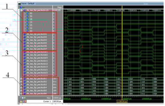 Computation results in the Waveform panel; ModelSim 10.5b environment: 1—input bits corresponding to the sensor states Un; 2—bits representing the binary values Ak; 3—bits corresponding to the values ; 4—bits representing the output results of the digital logarithm block bi.