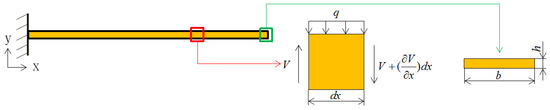where the moment of inertia is I, in which the rectangular section is considered in the experimental measurement with width b and height h. The ρ and A are the density and area, respectively. By incorporating the relationship between shear force, V, and bending moment, M, from the mechanics of materials into Equation (5), the governing equation can be derived.
