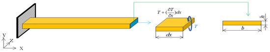 The following figure shows a free-body diagram of a small segment of a cantilever beam with length dx. Based on this infinitesimal element, as shown in Figure 3, the torsional equilibrium equation can be expressed as follows: