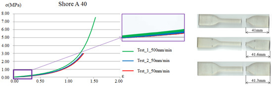 Young’s modulus is typically obtained as the slope of the linear elastic region in the tensile test for general metallic materials. However, in viscoelastic materials, the modulus E required for establishing the viscoelastic parameters in the Prony’s series is the instantaneous Young’s modulus E0, as described in Equation (6). Therefore, by analyzing the force–displacement data obtained from the tensile test, the Young’s modulus is extracted from the initial linear segment of the curve. Figure 6 presents one example of the tensile test results for a soft viscoelastic material with a Shore A hardness value 40. The tensile tests for Shore A hardness 50, 60, 70, 85, and 95 are conducted in the same manner as those for Shore A hardness 40.