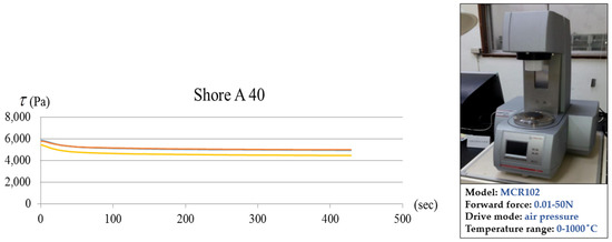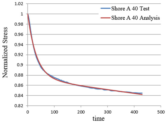 The instrument used in this study is a rotational dynamic rheometer, which is designed to analyze the deformation and flow behavior of materials under external forces. Typically, cylindrical specimens are used, and tensile or torsional loading is applied at a controlled temperature. This experiment conducted the test at room temperature (25 °C). Over time, an automatic load reduction mechanism was employed to partially remove the applied load while maintaining a constant total deformation. The reduction in stress over time was recorded to generate a stress relaxation curve. Through this experiment, the relationship between shear stress and time was obtained, as illustrated in Figure 7. The acquired data points were then input into FEM 7.3 software, combined with Young’s modulus obtained from the tensile test, to compute the Prony’s series parameters. Figure 8 compares the experimental stress relaxation results and the numerical analysis, as shown in one example of the soft viscoelastic material with a Shore A hardness value 40. The stress relaxation tests for Shore A hardness 50, 60, 70, 85, and 95 are conducted in the same manner as those for Shore A hardness 40.