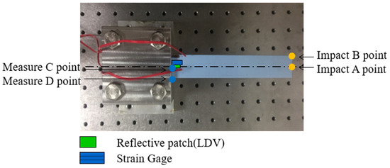 The collected signals were analyzed using Fast Fourier Transform (FFT) to extract dominant frequency components. Additionally, short-time Fourier transform (STFT) was employed to observe the evolution of modal frequencies over time, which is particularly important for identifying transient modes and assessing viscoelastic damping effects. The identified natural frequencies from the first bending mode were used for inverse calculation of material constants, such as Young’s modulus and Poisson’s ratio, based on the Euler–Bernoulli beam theory as outlined in Section 2. These calculated parameters were then used to predict higher-order vibration modes, which were cross-validated with the experimentally measured multi-mode resonant frequencies. The detailed experimental setup, including sensor placements and impact configuration, is illustrated in Figure 5.