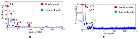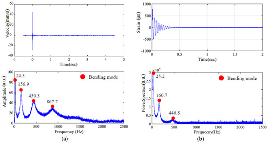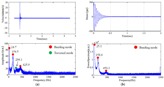 The specific layer is assumed to be homogeneous and isotropic. The originally designed dimensions were 170 × 25 × 3 mm; however, due to manufacturing process factors, the final dimensions were measured as 170 × 25.16 × 3.08 mm. The experimental boundary condition was a cantilever beam with a fixed end, where 18 mm of the specimen was clamped, reducing the effective length to 152 mm. Although this study primarily investigates bending modes, i.e., the most easily excited vibration type, torsional modes are also dedicated to exciting for identifying the dynamic property of the dual material. Figure 11, Figure 12 and Figure 13 present the impact of transient response and transferring as a frequency spectrum by fast Fourier transformation. As illustrated in Figure 11 and Figure 12, the hard material combined with soft Shore A 40 demonstrates the impact results at points A and B, respectively, based on measurements taken using both LDV and a strain gauge. It can be observed that only impacting point B is capable of exciting the torsional mode marked as a green dot. However, with the softer Shore A 40 material, the excitation of the torsional mode is less prominent. As shown in Figure 13, when the soft material is replaced with a slightly harder Shore A 95, the excitation and identification of the torsional mode become significantly easier.