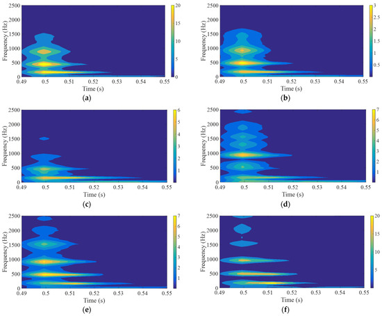 Short-time Fourier transforms of hard–soft dual material (Impact point A), (a) Shore A 40, (b) 50, (c) 60, (d) 75, (e) 85, (f) 95.