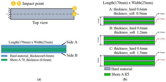 To further investigate the influence of soft viscoelastic layer thickness on torsional mode response, this study conducted dynamic impact simulations and experimental testing using three different thickness configurations. Excitation was applied at point B, and responses were measured at point D to effectively excite both bending and torsional modes of the structure. All specimens were designed as symmetric five-layer laminates, with rigid layers of 0.6, 0.9, and 1.2 mm thickness and soft viscoelastic layers made of Shore A 85 elastomer, as shown in Figure 15b.