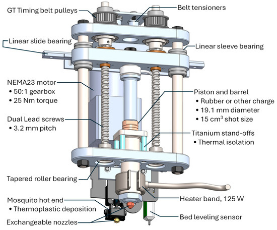 Multi-material printing was performed using an Ender 5 Pro (Creality, Shenzhen, China) modified with a custom print head, ARME 3XL, an enhanced version of the Additive Ram Material Extruder (ARME), which was originally developed for 3D printing with extrusion of fully compounded nitrile rubber [8]. Depicted in Figure 1, the ARME 3XL integrates a NEMA23 motor with a 50:1 gearbox that drives dual leadscrews (3.2 mm pitch) at speeds up to 18 RPM. A 19.1 mm diameter piston drives the extrusion through a barrel with a 62 mm shot length, delivering a maximum shot volume of 15 cm3. Each motor step (10,000 steps/rev) corresponds to 3.2 nm displacement and 0.0916 mm3 output, allowing precise material control. At 25 Nm torque, the extruder generates 18.6 kN of compressive force corresponding to a maximum extrusion pressure of 650 bar. Given this transmission design is directed to high force at low displacement, however, the maximum ram speed is 1.92 mm/s with a maximum flow rate of 0.55 cm3/s.