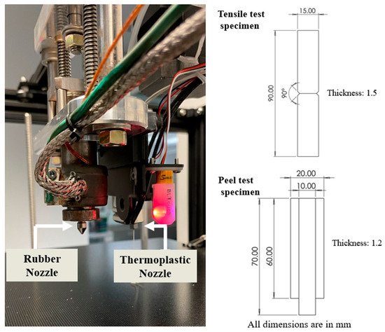 Two geometry types were printed for the adhesion tests. The geometries and dimensions are illustrated in Figure 2, as well as the ARME 3XL print head. For the tensile test, two materials were printed into a rectangular bar with a joint in the middle. A notch (angle of 45 degrees) was created at the joint of the two materials to ensure failure at the bonding area between the thermoset and thermoplastic for measuring the adhesion strength between the two materials. The printing pattern was perpendicular to the tensile direction. For the peel test, specimens were printed according to ASTM D429 [23] with a scale modification. The samples were printed using two patterns: one with the raster oriented perpendicular to the pull direction, and the other with the raster oriented parallel to the pull direction. Peel samples were fabricated by placing a Teflon film between the PC and rubber layers partway from the end to enable separation of the layers to create a peel sample. After printing, all the specimens were oven-cured at the selected temperatures for the specified duration to achieve 90% of the cure based on the RPA data.