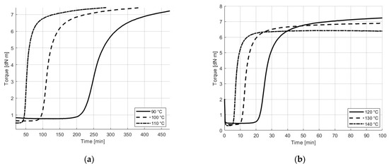 To determine the processing parameters of thermoset rubber, it is essential to observe the crosslinking and rheological behavior of the material. The curing process involves the chemical formation of crosslinks (in this system, sulfur) between the long polymer chains, resulting in a thermally induced three-dimensional elastic network [24,25,26]. In industry, the oscillating disk rheometer is frequently used to characterize the curing process of rubber, as specified in ASTM D2084-19a [22]. During this process, the necessary torque required for a sample to achieve a certain amplitude at a fixed temperature is measured, directly associating the torque with the units of crosslinks formed per unit volume of rubber [24]. The torque plotted against time is the cure curve.