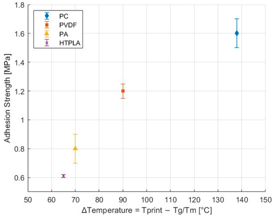 Adhesion strength between NBR and selected thermoplastics as a function of the temperature difference (ΔT) between the printing temperature and the highest transition temperature of each material. For amorphous polymers, ΔT = Tprint − Tg; for semicrystalline polymers, ΔT = Tprint − Tm.