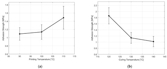 Effect of the (a) printing temperature and (b) curing temperature on the adhesion strength between NBR and PC.