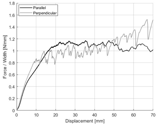 The anisotropy introduced by the filament deposition direction during printing is shown as a higher average peel force and greater variability in the 90° samples. Their force–displacement profiles were notably less steady than the 0° orientation, as shown in Figure 6. These fluctuations are likely caused by local variations in interfacial contact between the NBR and PC layers. In the 90° configuration, the NBR raster lines intersect the PC surface at discrete intervals, resulting in a non-uniform contact area along the peel path. Specifically, some regions achieve complete contact at the interface, while others contain inter-raster voids or partial bonding due to gaps between layers. As the effective contact area varies along the specimen, the peel resistance also fluctuates, reflecting alternating zones of stronger and weaker adhesion.