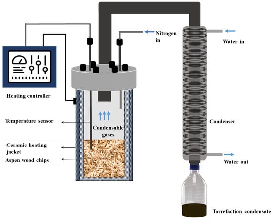 A batch-type reactor system (Figure 1) was used for performing torrefaction. Approximately 150 g of oven-dried wood chips were weighed and transferred to the reaction vessel. The reactor assembly was completed by tightening the lid and attaching the condenser set-up. To maintain an inert environment, nitrogen gas was used, with a flow meter controller (Vögtlin Instruments GmbH, Herne, Germany). To ensure an inert atmosphere, prior to heating, the reactor was flushed with nitrogen at a rate of 8 L/min for 10 min, which was later reduced to 4 L/min. The reactor was heated using a ceramic band heater and controlled by a proportional–integral–derivative controller. Temperature data was constantly monitored using PicoLog data logger(version TC-08, Pico Technologies, Cambridgeshire, UK). Torrefaction was performed at four different temperatures (225 °C, 250 °C, 275 °C, and 300 °C) at a fixed residence time of 1 h. All condensable gases were collected via a cold-water condenser unit as a dark, aromatic liquid condensate. After torrefaction, the reactor set-up was allowed to cool, and the torrefied biomass was collected, weighed, and stored in air-tight glass containers for further analyses. Before further experiments, the torrefied wood chips were milled and sieved to a particle size of <4 mm using a Retsch SM100 mill (Retsch GmbH, Haan, Germany).