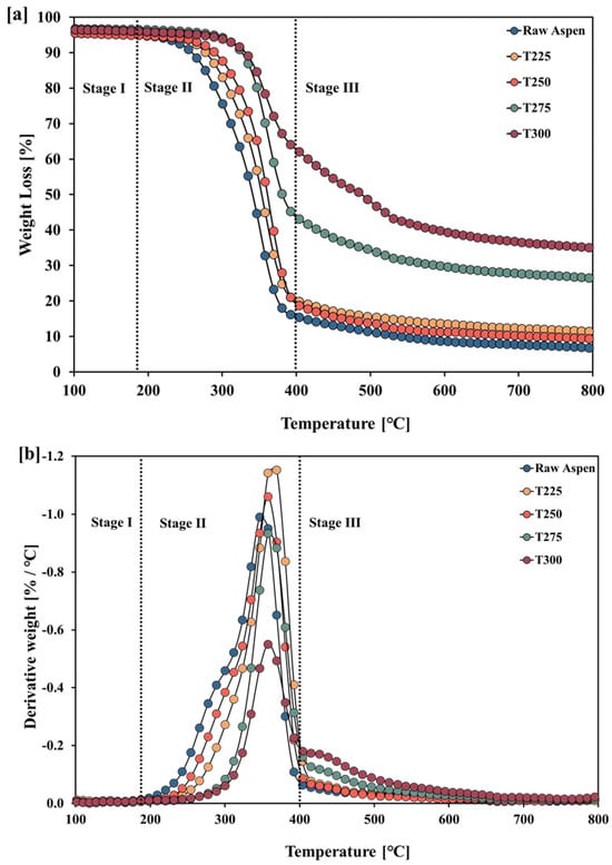 TGA and DTG analyses for raw aspen and torrefied aspen at different temperatures are shown in Figure 3a and Figure 3b, respectively. The samples were heated from 25 to 800 °C at a constant heating rate of 20 °C/min under an N2 atmosphere. The thermal degradation of lignocellulosic biomass components typically occurs within the ranges of 200–315 °C for hemicellulose, 315–400 °C for cellulose, and 250–500 °C for lignin [33,34,43]. In Stage I, meagre weight loss due to moisture evaporation was observed in both untreated and torrefied aspen, primarily because both raw and torrefied materials were dried at 105 °C prior to analysis [43]. Stage II corresponds to the primary decomposition phase. During this phase, in the DTG curve, a shoulder peak appears only for the raw aspen sample, while broader, merged peaks are obtained for 250 °C and 225 °C due to the partial degradation of hemicellulose followed by the formation of more stable hemicellulose residues in this temperature range, which then decompose simultaneously with cellulose [44]. A significant weight loss of approximately 70% was observed between 220 °C and 400 °C, as indicated by TGA and DTG curves. This is attributed to the complete breakdown of hemicellulose and cellulose. During Stage III, an additional weight loss of around 25% was recorded between 400 °C and 600 °C, represented by a broad region in the TGA curve and a small DTG peak, reflecting the gradual degradation of lignin. Above 600 °C, no significant weight loss was detected, indicating the formation of char and the completion of biomass conversion.